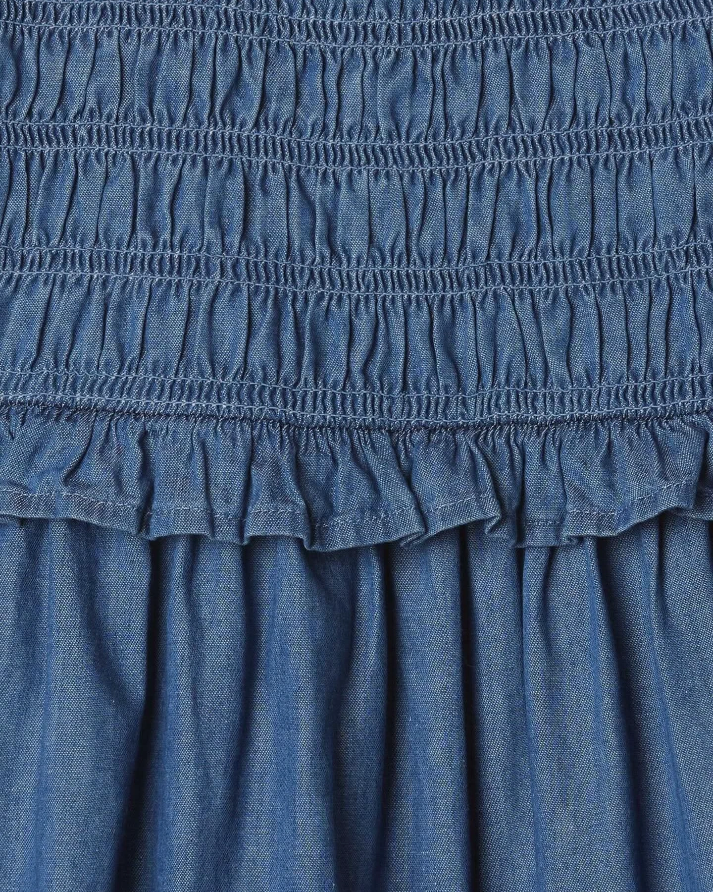SMOOTH CHAMBARY WEAVE WITH RUFFLE TRIM.