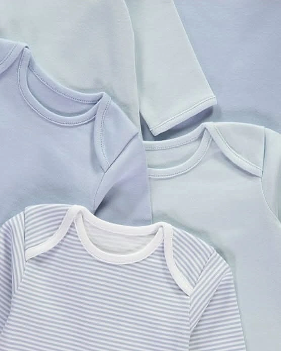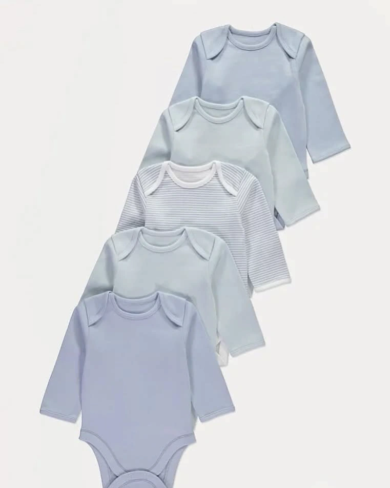SAY GOODBYE TO MISMATCHED ONESIES WITH THIS 5-PACK OF LONG SLEEVE BODYSUITS-PERFECT FOR LAYRING OR WEARING SOLO. SOFT 100%, ENVELOPE SHOULDERS, AND COLOR-CODED POPPERS FOR EASY DRESSING.