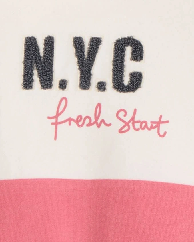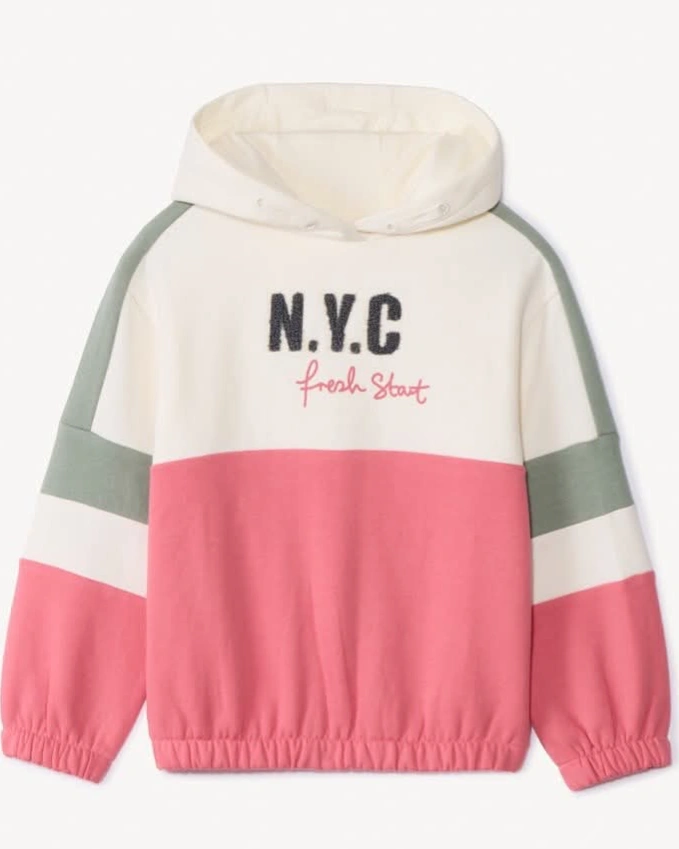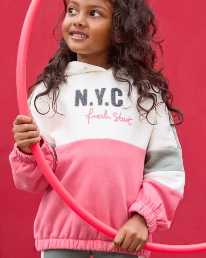 NYC STYLE FOR LITTLE ONES!BRING THE CITY VIBES TO YOUR CHILDS WARDROBE WITH THIS ULTRA-SOFT BRUSHED FLEECE HOODIE! FEATURING COOL "NYC" 3D PATCH DETAILS AND AN ALL-OVER BLOCK COLOR DESIGN IN BEIGE-KHAKI-PINK, IT'S THE PERFECT COMBO OF COZY AND TRENDY.