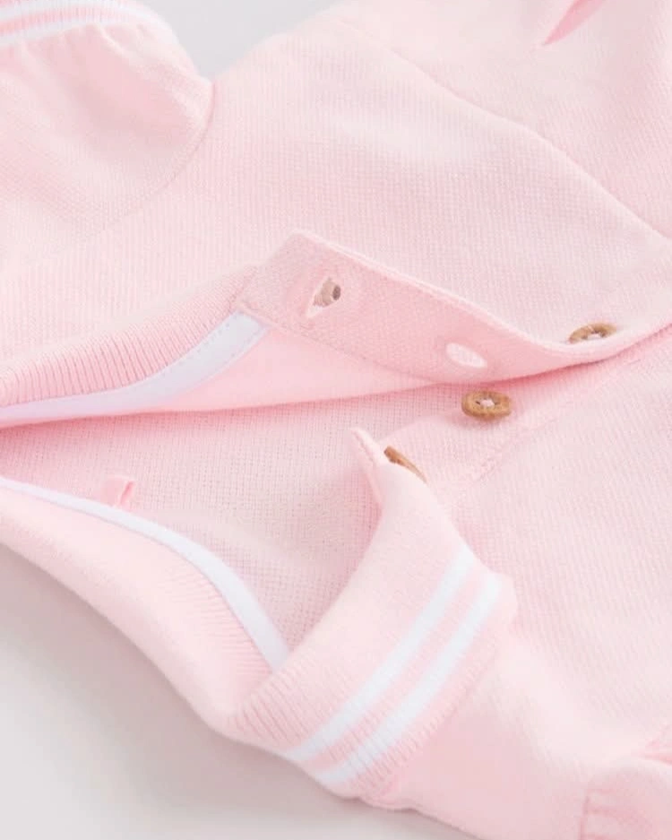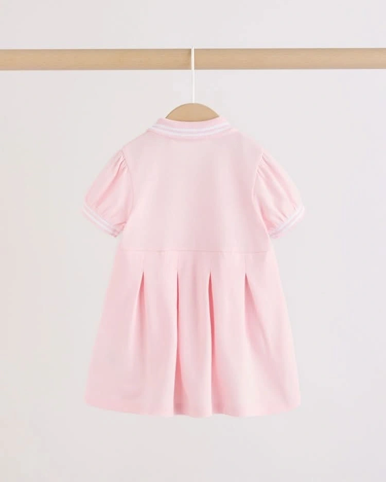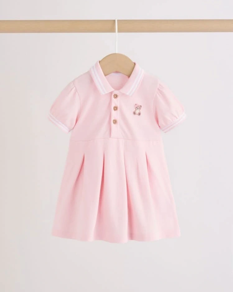 THIS WHITE SHORT SL.EEVE BABY DRESS IS PURE TINY TREASURE. SOFT COTTON JERSEY, BUTTON-FRONT DETAIL, AND BIULT-IN KICKERS
