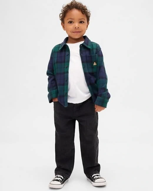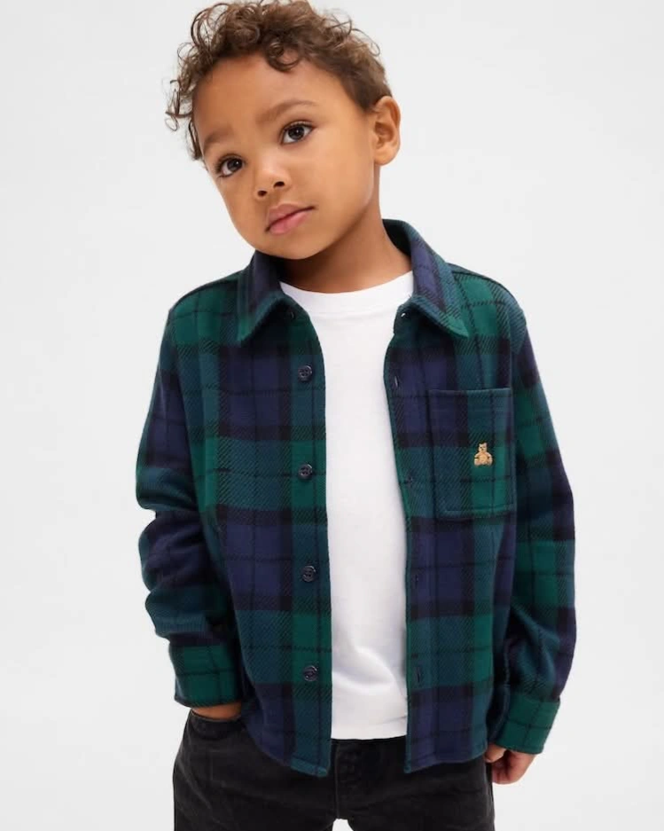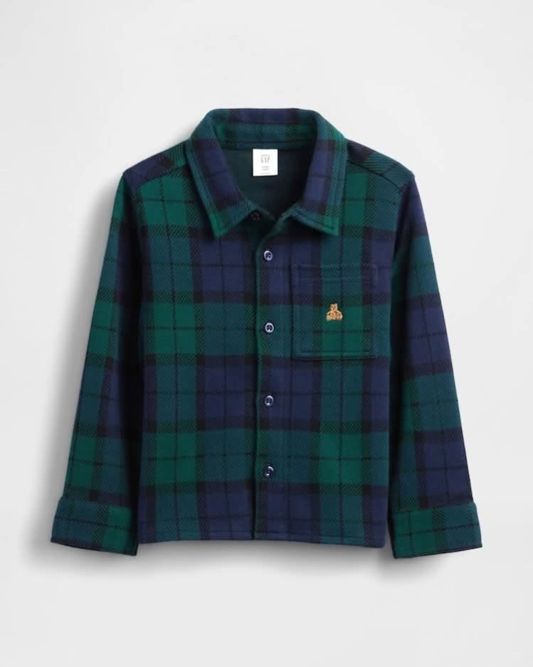 THIS SOFT KNIT JERSEY BUTTON-DOWN FROM GAP IS THE PERFECT HOLIDAY OR EVERYDAY PIECE. FEATURING AN ADORABLE EMBROIDERED BRANNAN BEAR PATCH, A CLASSIC CHECK PATTERN, AND 100% COTTON COMFORT- IT'S AS PRACTICAL AS IT IS SWEET