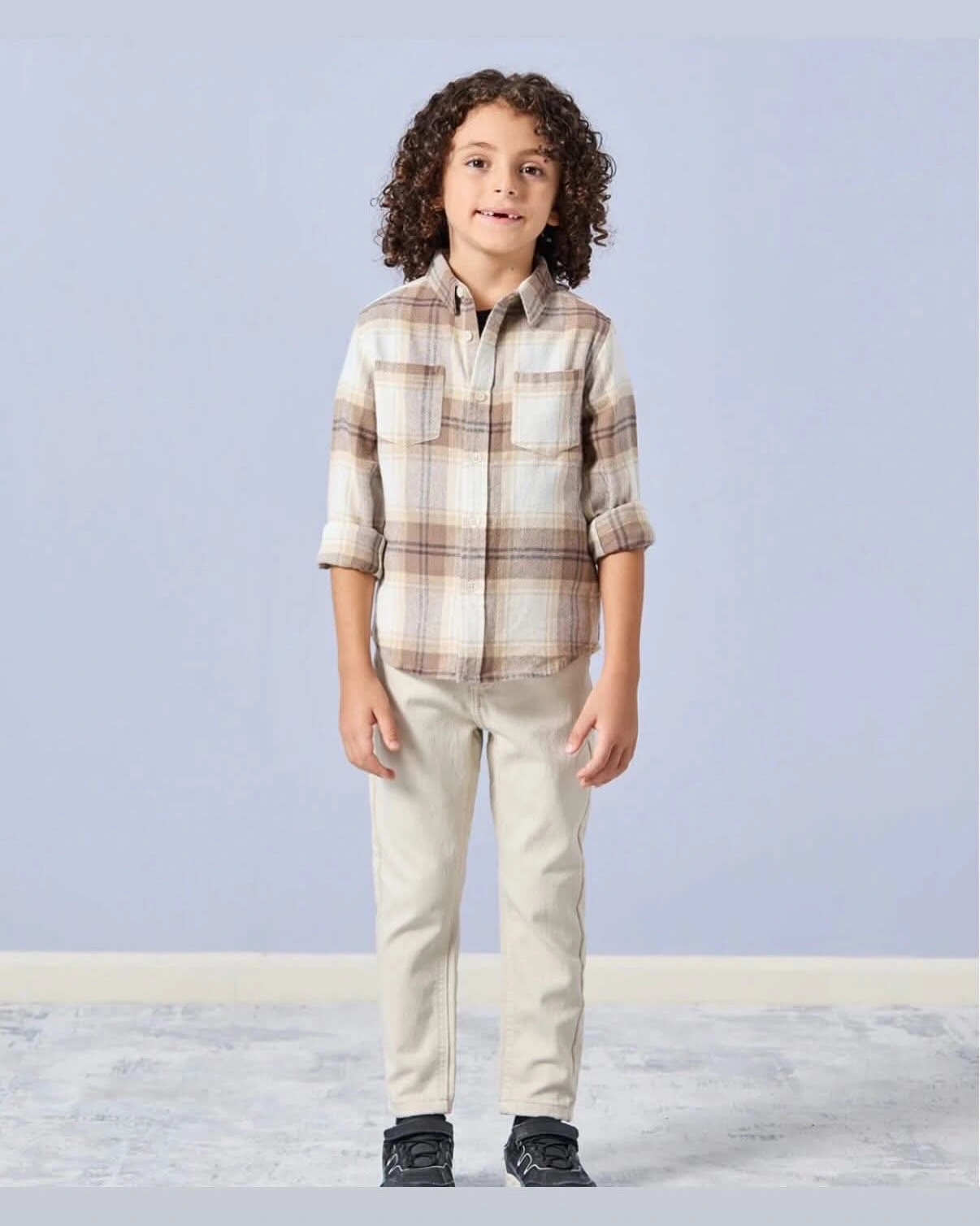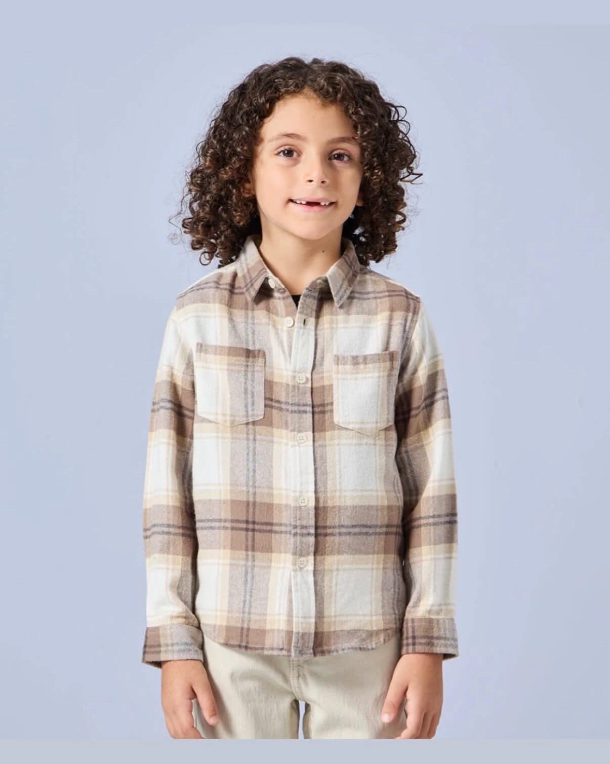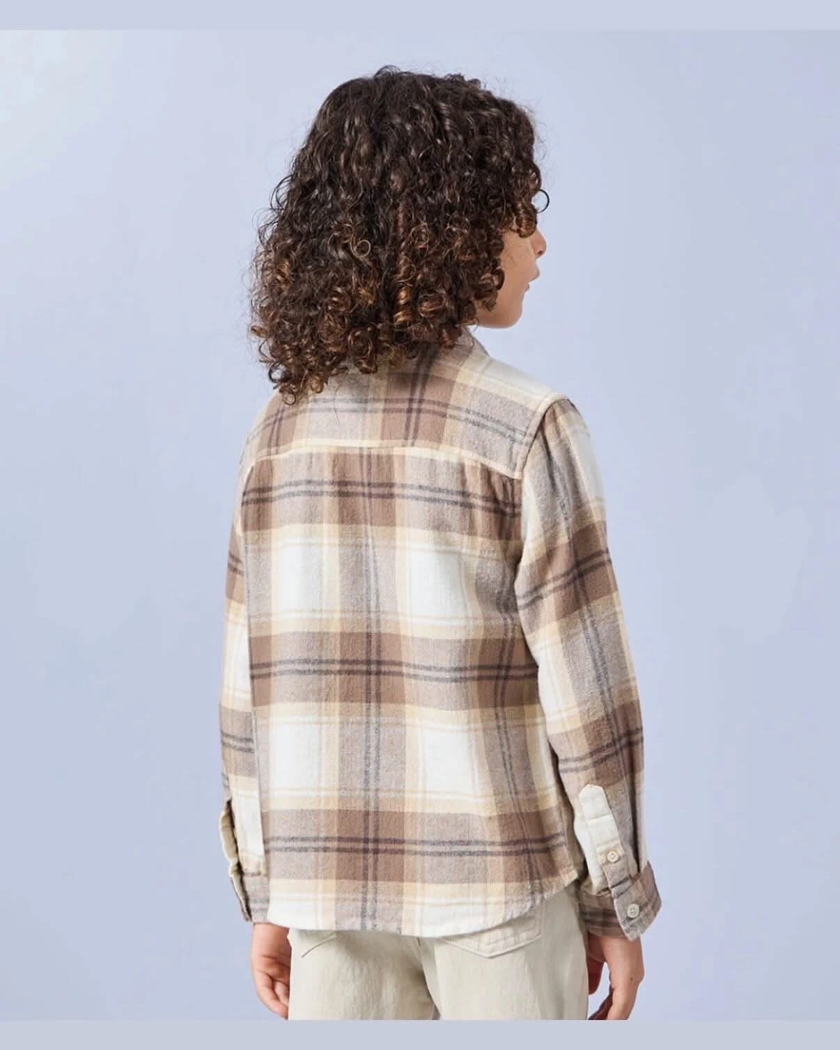 OUR BOYS CREAM CHECKED SHIRT IS HERE-- CRAFTED FROM 100% SOFT COTTON FOR LASTING COMFORT AND A TIMELESS OXFORD LOOK. PERFECT FOR FORMAL EVENTS OR ELEVATING STYLE.
